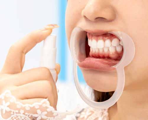 ホワイトニング溶液をスプレーで歯に吹きかけます。